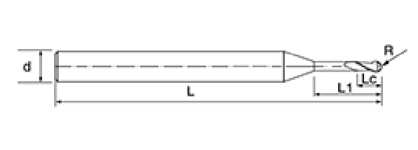 | Nie | Priemer D | R Uhol R | Dĺžka flauty Lc | Efektívna dĺžka L1 | Celková dĺžka L | Shank Dia d | Počet čepelí F |