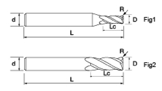 | Nie | Priemer D | R Uhol R | Dĺžka flauty Lc | Celková dĺžka L | Shank Dia d | Počet čepelí F |