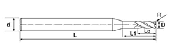 | Nie | Priemer D | R Uhol R | Dĺžka flauty Lc | Efektívna dĺžka L1 | Celková dĺžka L | Shank Dia d | Počet čepelí F |