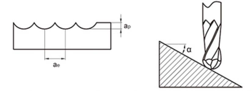 | Polomer guľovej hlavy (mm) | Rýchlosť otáčania (min -1 ) | Rýchlosť podávania (mm/min) | a p (mm) | a e (mm) | Rýchlosť otáčania (min -1 ) | Rýchlosť podávania (mm/min) | a p (mm) | a e (mm) | Rýchlosť otáčania (min -1 ) | Rýchlosť podávania (mm/min) | a p (mm) | a e (mm) |