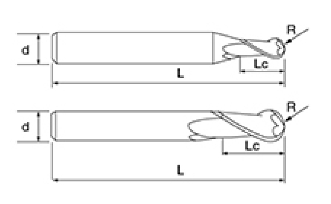 | Nie | Priemer D | R Uhol R | Dĺžka flauty Lc | Celková dĺžka L | Shank Dia d | Počet čepelí F |