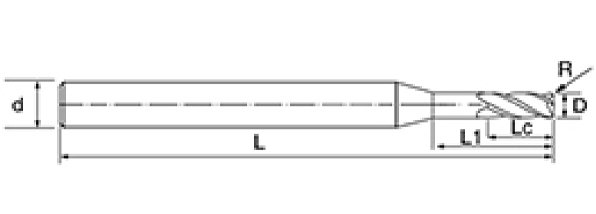 | Nie | Priemer D | R Uhol R | Dĺžka flauty Lc | Efektívna dĺžka L1 | Celková dĺžka L | Shank Dia d | Počet čepelí F |
