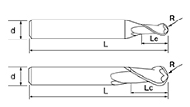 | Nie | Priemer D | R Uhol R | Dĺžka flauty Lc | Celková dĺžka L | Shank Dia d | Počet čepelí F |