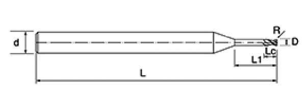 | Nie | Priemer D | R Uhol R | Dĺžka flauty Lc | Efektívna dĺžka L1 | Celková dĺžka L | Shank Dia d | Počet čepelí F |
