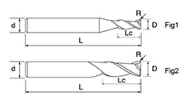 | Nie | Priemer D | R Uhol R | Dĺžka flauty Lc | Celková dĺžka L | Shank Dia d | Počet čepelí F |