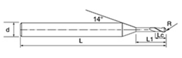 | Nie | Priemer D | R Uhol R | Dĺžka flauty Lc | Efektívna dĺžka L1 | Celková dĺžka L | Shank Dia d | Počet čepelí F |