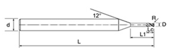 | Nie | Priemer D | R Uhol R | Dĺžka flauty Lc | Efektívna dĺžka L1 | Celková dĺžka L | Shank Dia d | Počet čepelí F |