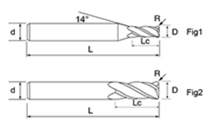 | Nie | Priemer D | R Uhol R | Dĺžka flauty Lc | Celková dĺžka L | Shank Dia d | Počet čepelí F |